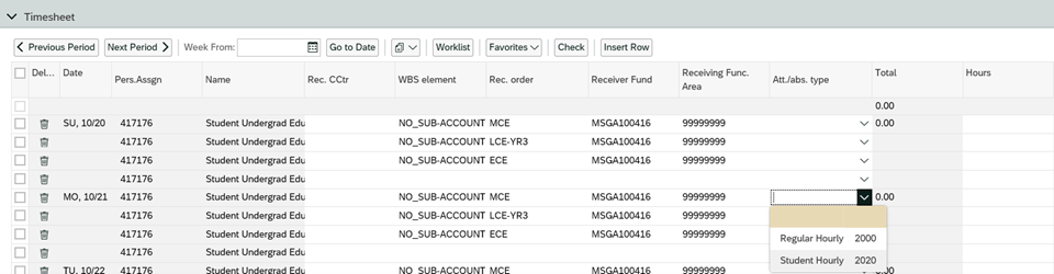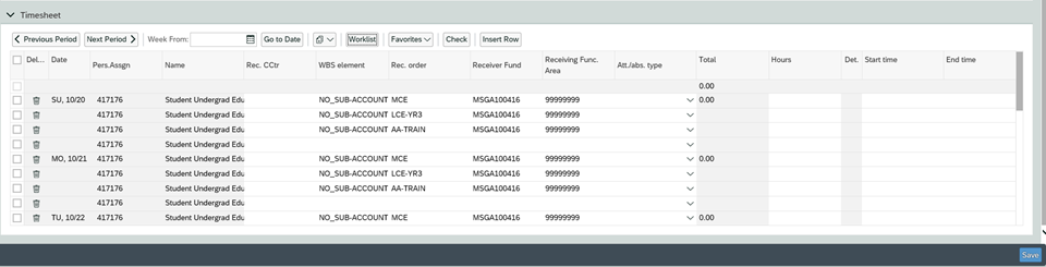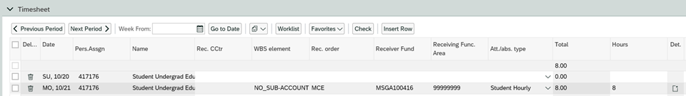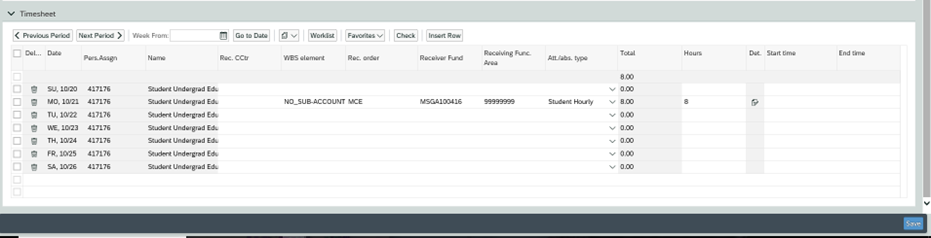 - Once the desired fund(s) are selected, The Time Sheet will be populated with the funding information. There can be multiple entries (rows) for the same day if more than 1 funding string is required
