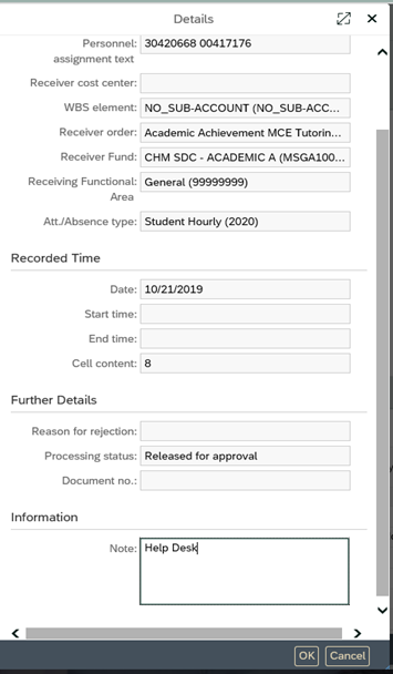 - A comment can be entered into the details box that can be viewed by the time approver (example Help Desk). There is a 40 character maximum. The details also display the funding information, date, and hours for review. Click the icon in the Details Column.