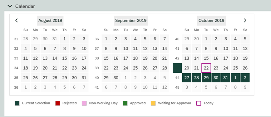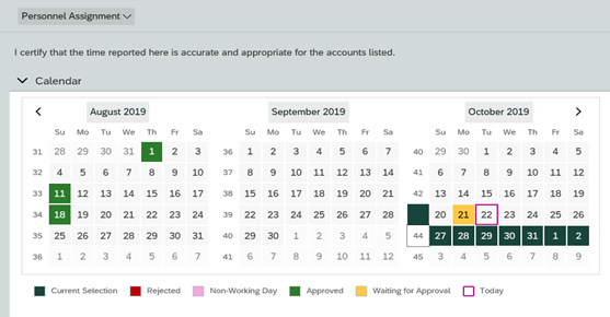 - Entries will appear yellow in the calendar view indicating Awaiting Approval